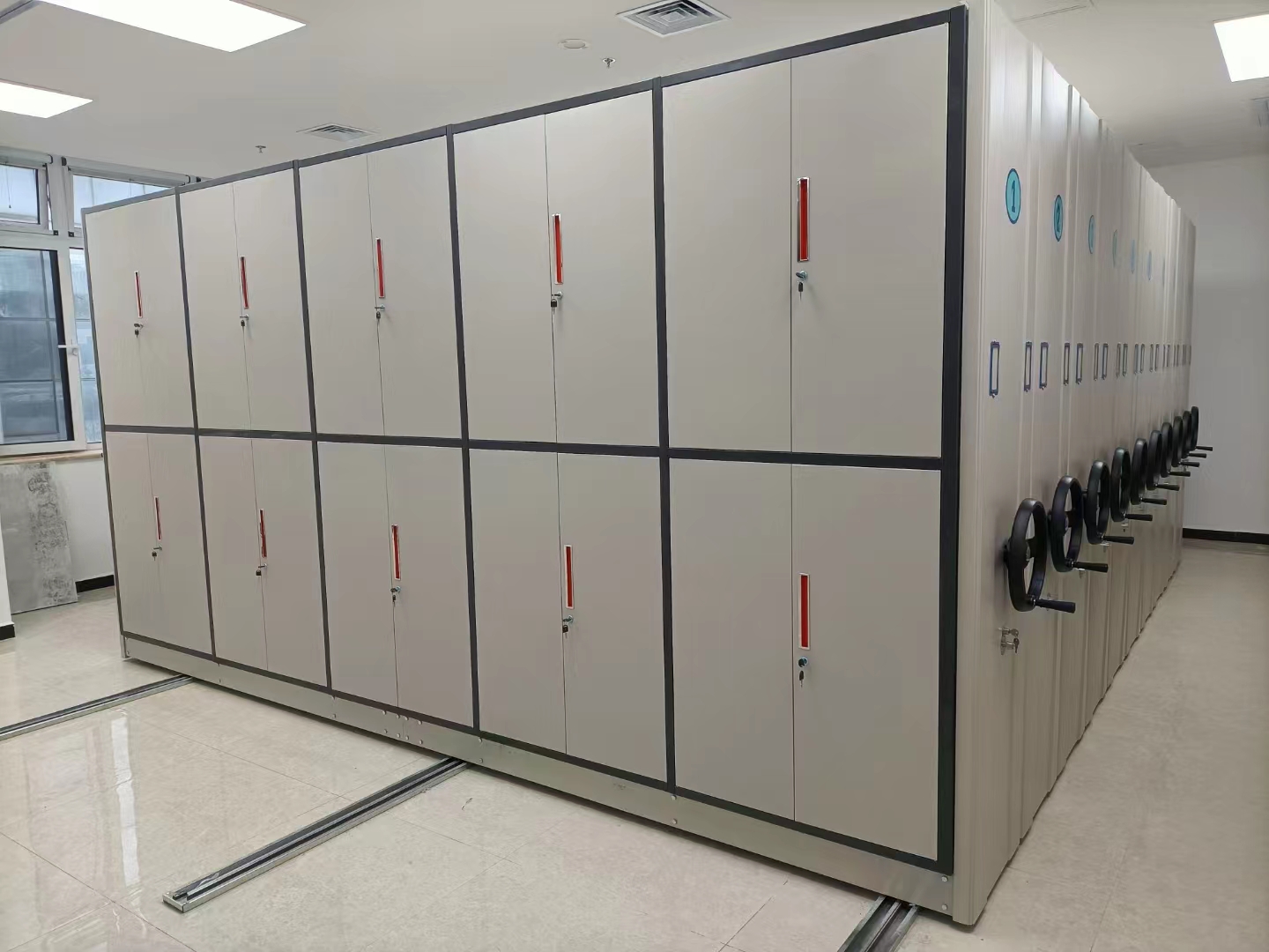 2、密集柜每列密集架均裝有制動裝置,開閉方便。開架查取資料時只需按下制動把手,架體不會被他人移動,可有效地保證查閱人員的人身安全。