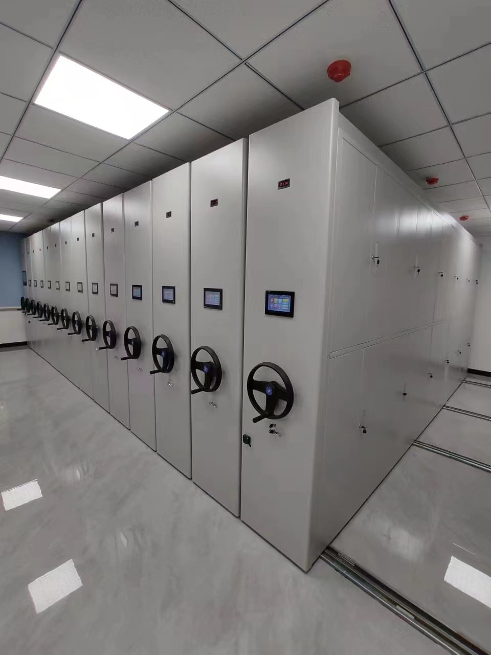 2、密集柜固定列移動列可采用安裝240*128點陣藍(lán)底觸摸液晶屏(選裝系統(tǒng)),此觸摸液晶屏能接收由電腦數(shù)據(jù)庫傳送下來的數(shù)據(jù),能自動顯示密集架中溫度與濕度,并能瀏覽電腦中的檔案數(shù)據(jù)庫,管理人員能直接在此觸摸屏上操作密集架,并可通過查詢到的數(shù)據(jù)直接打開此區(qū)中任何相對應(yīng)的密集架,方便,快捷。
